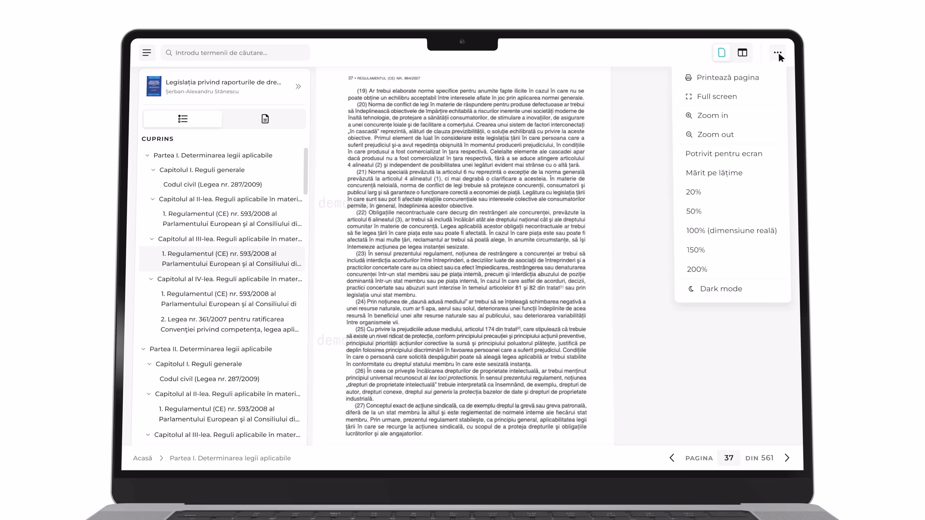 Biblioteca Hamangiu includes a sophisticated e-book reader designed to meet the needs of legal professionals. This feature allows users to access and read law books, articles, and magazines seamlessly within the platform. The reader supports intuitive navigation, annotations, and bookmarking, enhancing the user experience for comprehensive legal research and study.
